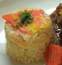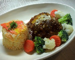 茸の煮込みハンバーグにキャロットピラフを添えて